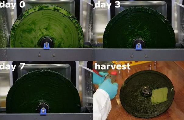 荷蘭瓦赫寧根大學(xué)開發(fā)的“藻盤”(Algadisk)式微藻培養(yǎng)系統(tǒng),藻盤上生長的貼附藻細(xì)胞濃度可以達(dá)到固含量15-20%(差不多是碟片式離心機(jī)離心后的藻濃度)。土耳其的MikroAlg公司利用“藻盤”裝置生產(chǎn)微藻生物肥料。