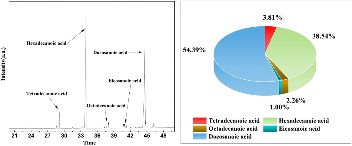 為了高效地將微藻轉(zhuǎn)化為有價(jià)值的和可再生的燃料,首先得提取藻油,然后轉(zhuǎn)化為第二代的生物柴油。藻油提取過程中,因?yàn)闃O性的細(xì)胞膜易溶于極性溶劑中,極性的甲醇,為最佳提取溶劑,提取率為47.8%。藻油中,38.54%為十六烷酸,54.39%為二十二烷酸。在藻油的脫氧催化反應(yīng)中,因?yàn)殁?鋁納米片具有更高的鈷含量以及層狀結(jié)構(gòu),可暴露出更多的鈷位點(diǎn),具有更大的色散以及更小的粒徑,鈷-鋁納米片比鈷-氧化鋁具有更高的催化活性。當(dāng)反應(yīng)溫度上升到240℃,可獲得100%的轉(zhuǎn)化率以及100%的烷烴收率,繼續(xù)升高溫度會(huì)產(chǎn)生裂化反應(yīng)。