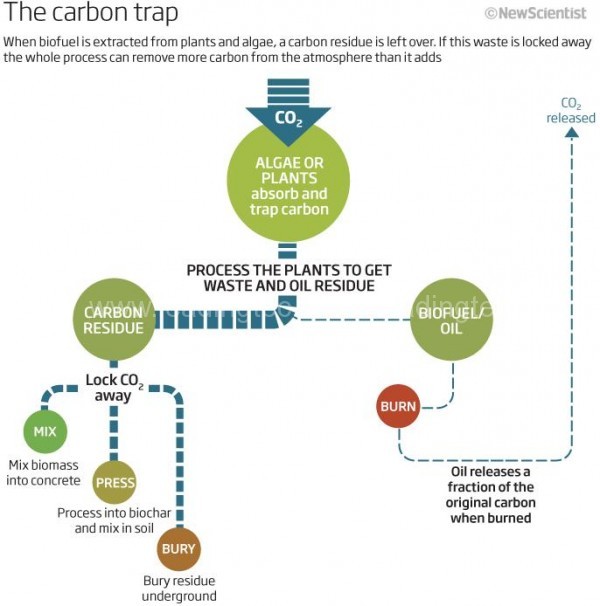 確實,這不是什么普通的石油。它屬于一類神奇的“負碳”燃料,能把碳從大氣中抽出并一勞永逸地封鎖起來。其中倒也沒什么深奧的原理——你栽種某種植物(在這里是藻類),待它們從空氣中吸收一定的CO2,將它們的油份榨出,就能得到碳含量豐富的殘渣。它們正是“負碳燃料”的關鍵。如果將這殘渣中的碳貯存起來,暫時阻止它們分解到空氣中,空氣中CO2的減少量就會超過這些生物燃料的排放量。