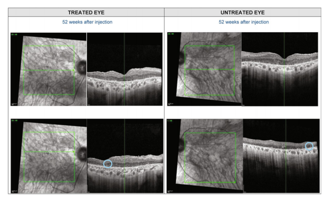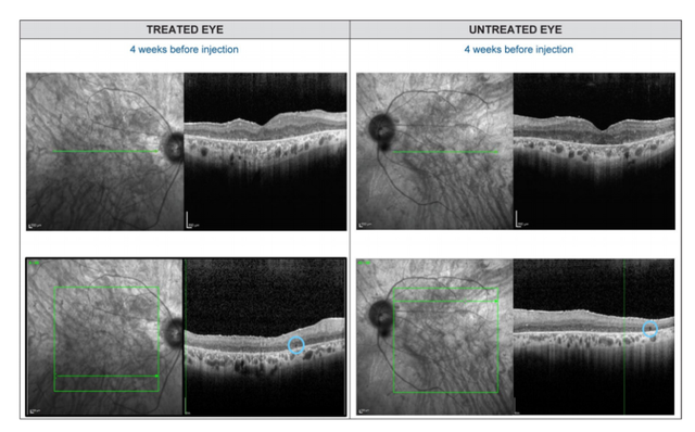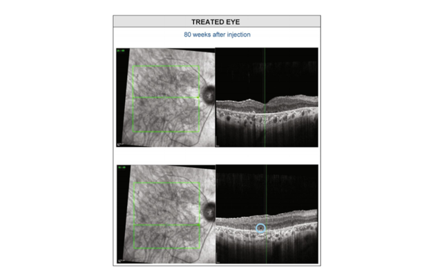 在注射前和注射后,研究人員對患者進(jìn)行了眼科檢查,并根據(jù) 84 周的方法評估了視網(wǎng)膜的解剖結(jié)構(gòu)。