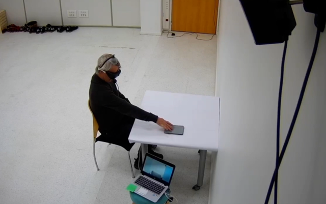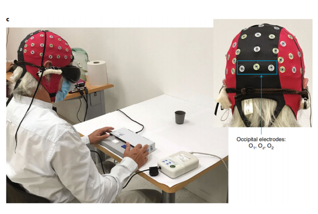 如下圖,患者正在戴著護(hù)目鏡來讓參與治療的眼睛去感知、定位、計數(shù)和觸摸不同的物體。在視覺感知過程中,研究人員還給他戴上一頂非侵入性腦電圖(EEG,Electroencephalogram)帽,實(shí)驗(yàn)中這頂帽子可以讀出大腦皮層的神經(jīng)元活動,從而測量恢復(fù)的部分視力。