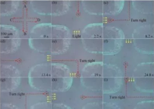 藻類細(xì)胞在水中是任意游動(dòng)的,如何實(shí)現(xiàn)其機(jī)器人化運(yùn)動(dòng)及向外界做功是生物學(xué)與機(jī)器人學(xué)交叉領(lǐng)域的難點(diǎn)問題。2005年,Weibel等首次報(bào)道了利用衣藻細(xì)胞趨光性控制細(xì)胞在微流控管道內(nèi)往復(fù)運(yùn)動(dòng),并通過衣藻細(xì)胞帶動(dòng)直徑1~6 μm的聚苯乙烯小球運(yùn)動(dòng),但該研究中衣藻細(xì)胞是在一段直管道內(nèi)往復(fù)運(yùn)動(dòng)。為了控制藻類細(xì)胞進(jìn)行更復(fù)雜的運(yùn)動(dòng),中國(guó)科學(xué)院沈陽(yáng)自動(dòng)化研究所微納米課題組開發(fā)了藻類細(xì)胞引導(dǎo)系統(tǒng)(Algae Guiding System, AGS)。通過該系統(tǒng)可以控制藻類細(xì)胞定向運(yùn)動(dòng),使其依次通過十字形微流控管道,遍歷4條管道后又回到出發(fā)點(diǎn),如下圖所示。通過合理規(guī)劃AGS光源的運(yùn)動(dòng),可實(shí)現(xiàn)藻類細(xì)胞機(jī)器人在二維空間沿任意設(shè)定路徑的運(yùn)動(dòng),包括沿三角形、長(zhǎng)方形、方波形等路徑運(yùn)動(dòng)。