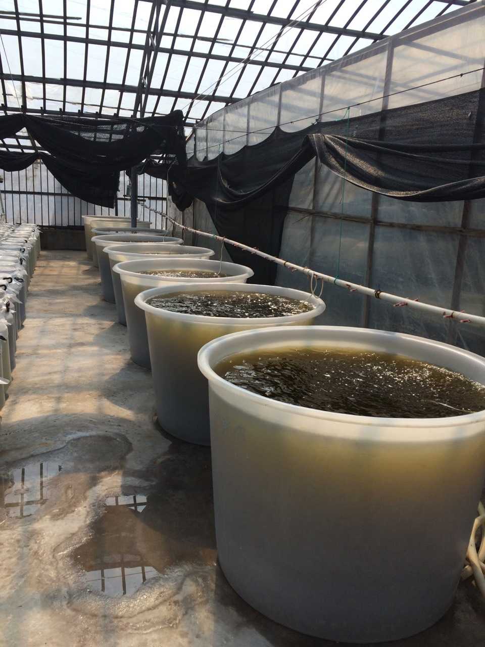 一個苗場一天需要大概投喂100-500噸不等的藻液,這些藻液下去不一定全部吃光,等到藻色吃清就要排水補(bǔ)入新鮮的藻類。這種每天的循環(huán)培藻和補(bǔ)藻為貝類苗種提供足夠的食物,提高貝苗成活率,降低市場價格,泥蚶苗種從每斤幾萬降到幾百元。