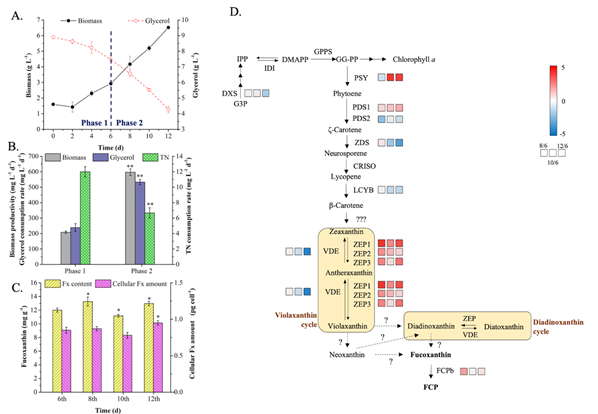 該研究先在搖瓶中優(yōu)化了三角褐指藻的兼養(yǎng)培養(yǎng)條件,發(fā)現(xiàn)在較高接種密度(1×107cells/mL)和較低光照強(qiáng)度(20 μmol/m2/s)下,有利于三角褐指藻生物量和巖藻黃素積累。在紅藍(lán)混合光(6:1)和純藍(lán)光照射下,可分別達(dá)到最大生物量濃度(5.53 g/L)和最高巖藻黃素含量(16.28 mg/g)。因此,在第一階段采用紅藍(lán)混合光(6:1)用于促進(jìn)細(xì)胞生長(zhǎng),在第二階段采用加強(qiáng)藍(lán)光及補(bǔ)氮操作,用于促進(jìn)生物量及巖藻黃素積累。通過(guò)轉(zhuǎn)換光質(zhì)和補(bǔ)氮的兩步法操作,三角褐指藻在第二階段獲得了最高生物量濃度(6.52 g/L)和巖藻黃素產(chǎn)率(8.22mg/L/d。與第一階段相比,每個(gè)細(xì)胞內(nèi)巖藻黃素含量(pg/cell)提升了12%。對(duì)巖藻黃素合成途徑中關(guān)鍵基因的轉(zhuǎn)錄水平的qRT-PCR分析表明,在第二階段中編碼八氫番茄紅素合成酶(PSY)、玉米黃質(zhì)環(huán)氧化酶(ZEP)和巖藻黃素葉綠素復(fù)合蛋白體b FCPb)的基因轉(zhuǎn)錄水平顯著上調(diào),而編碼紫黃素環(huán)氧化酶(VDE)的基因轉(zhuǎn)錄水平顯著下調(diào),結(jié)果顯著提升了巖藻黃素含量。