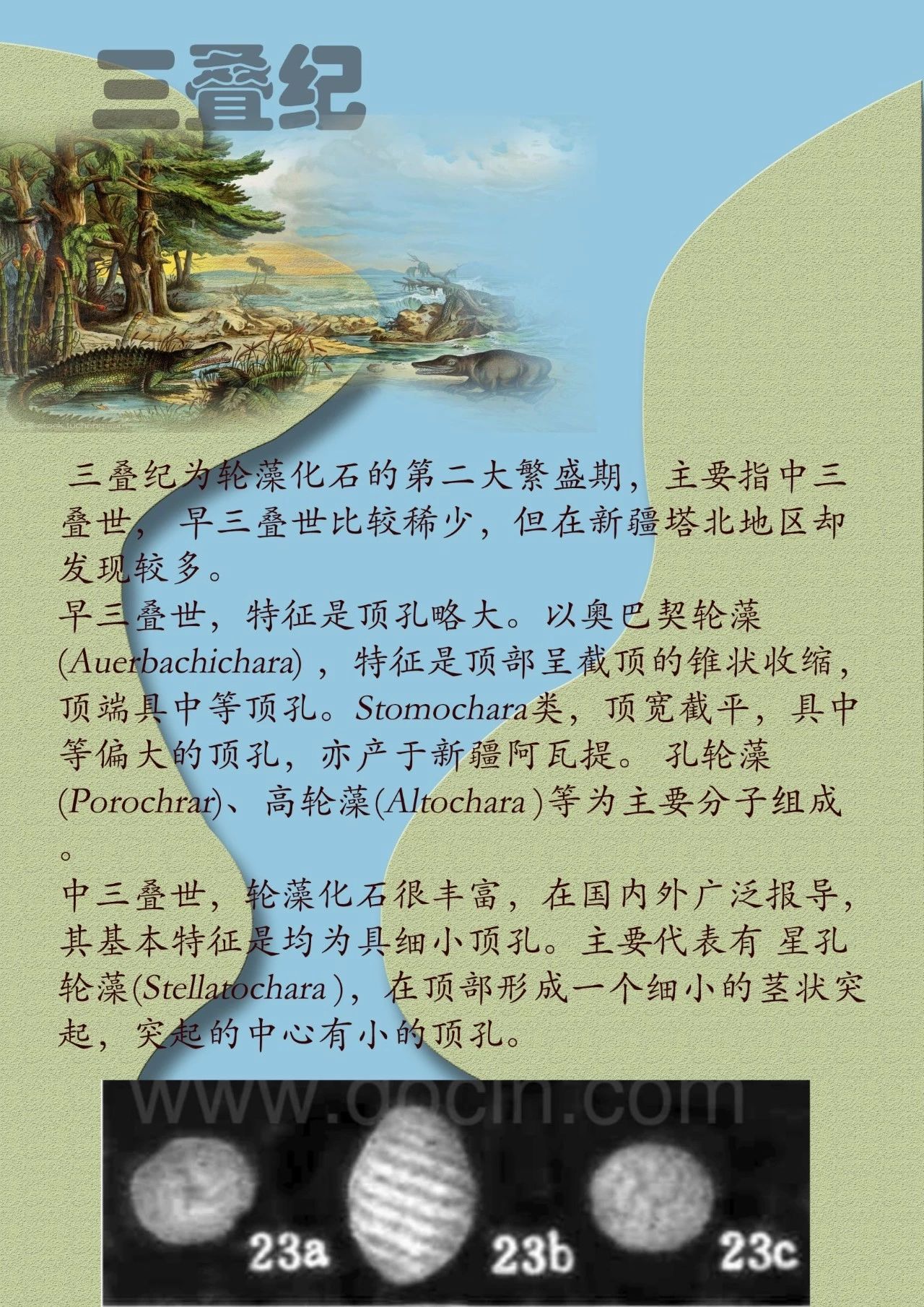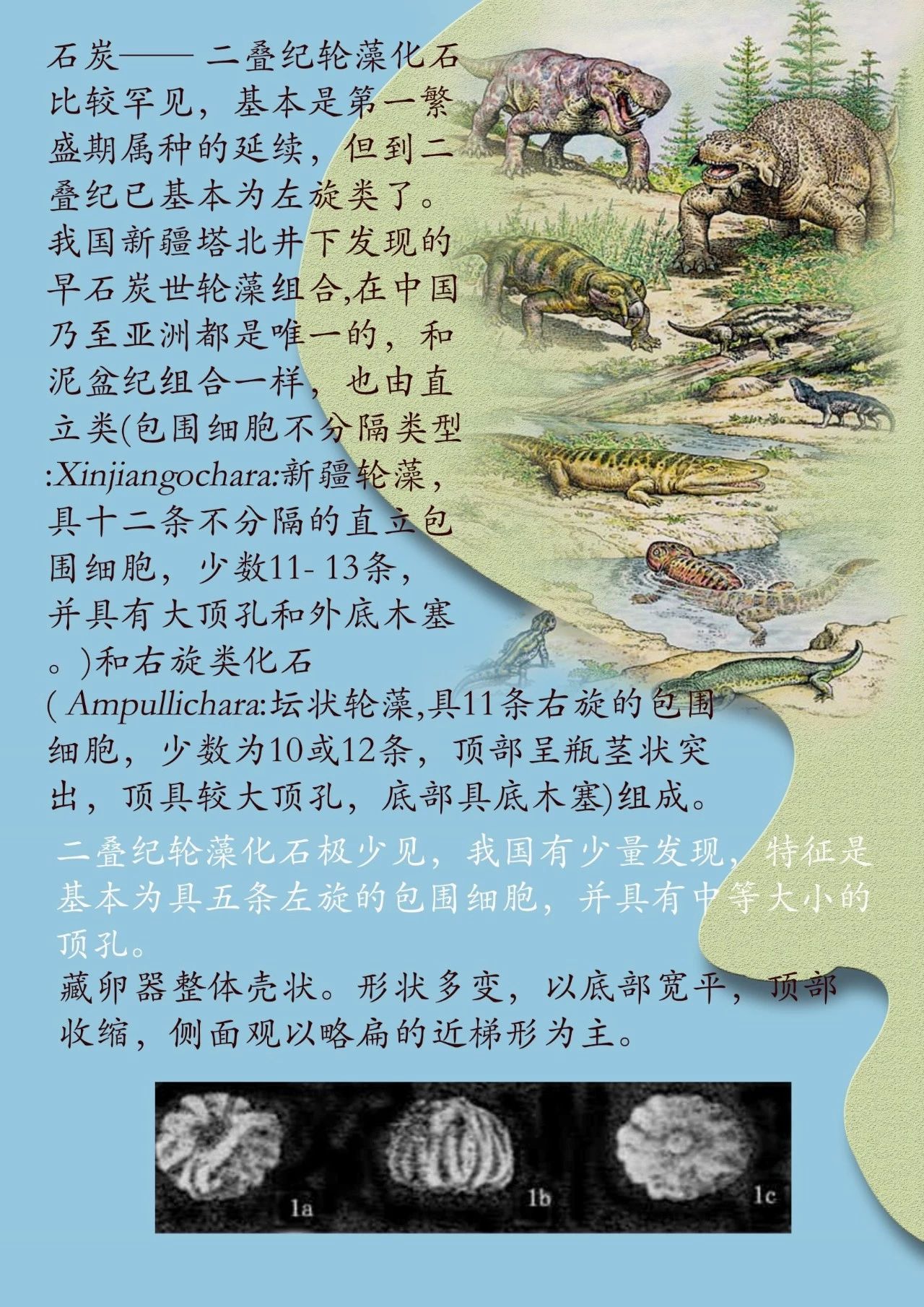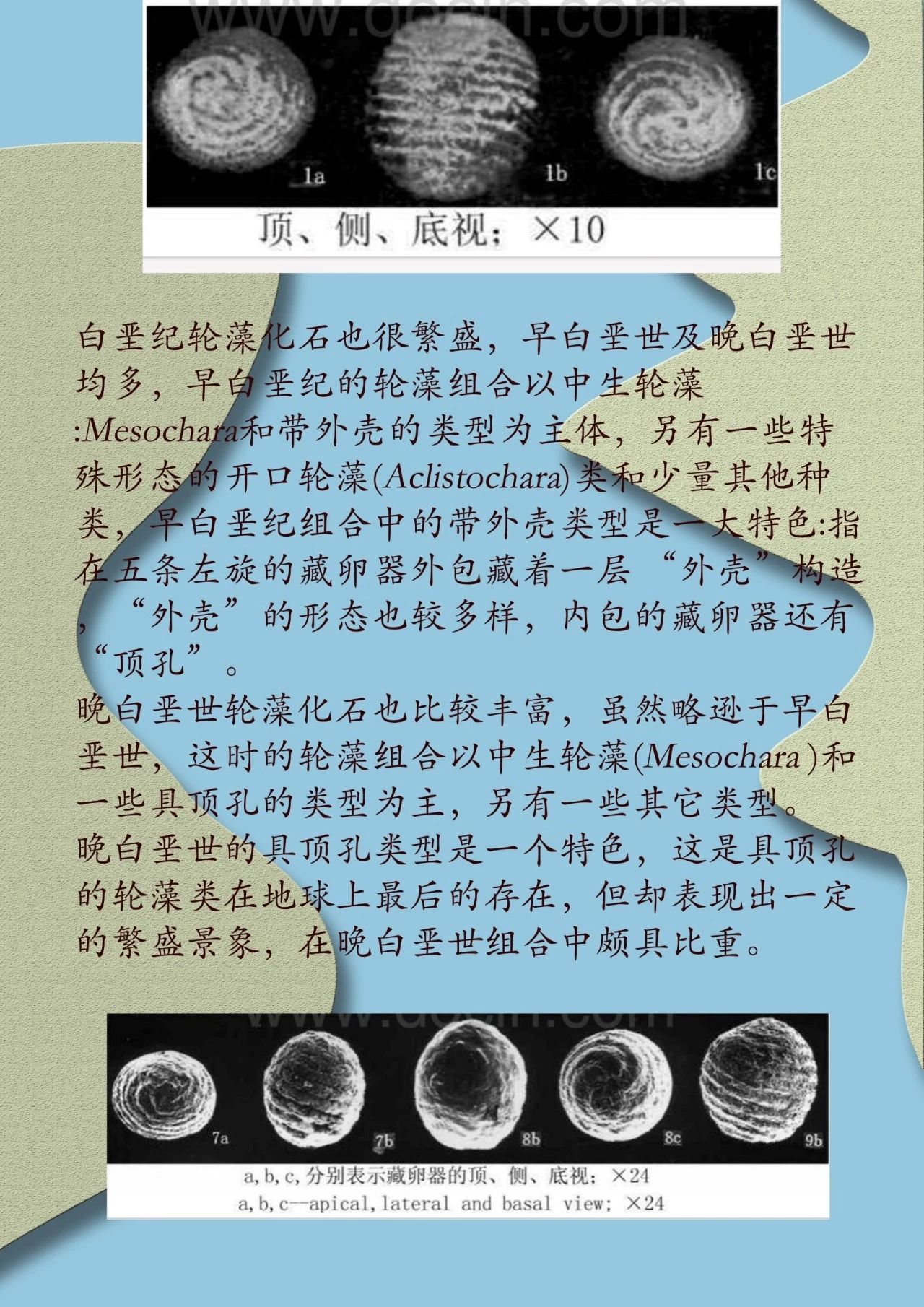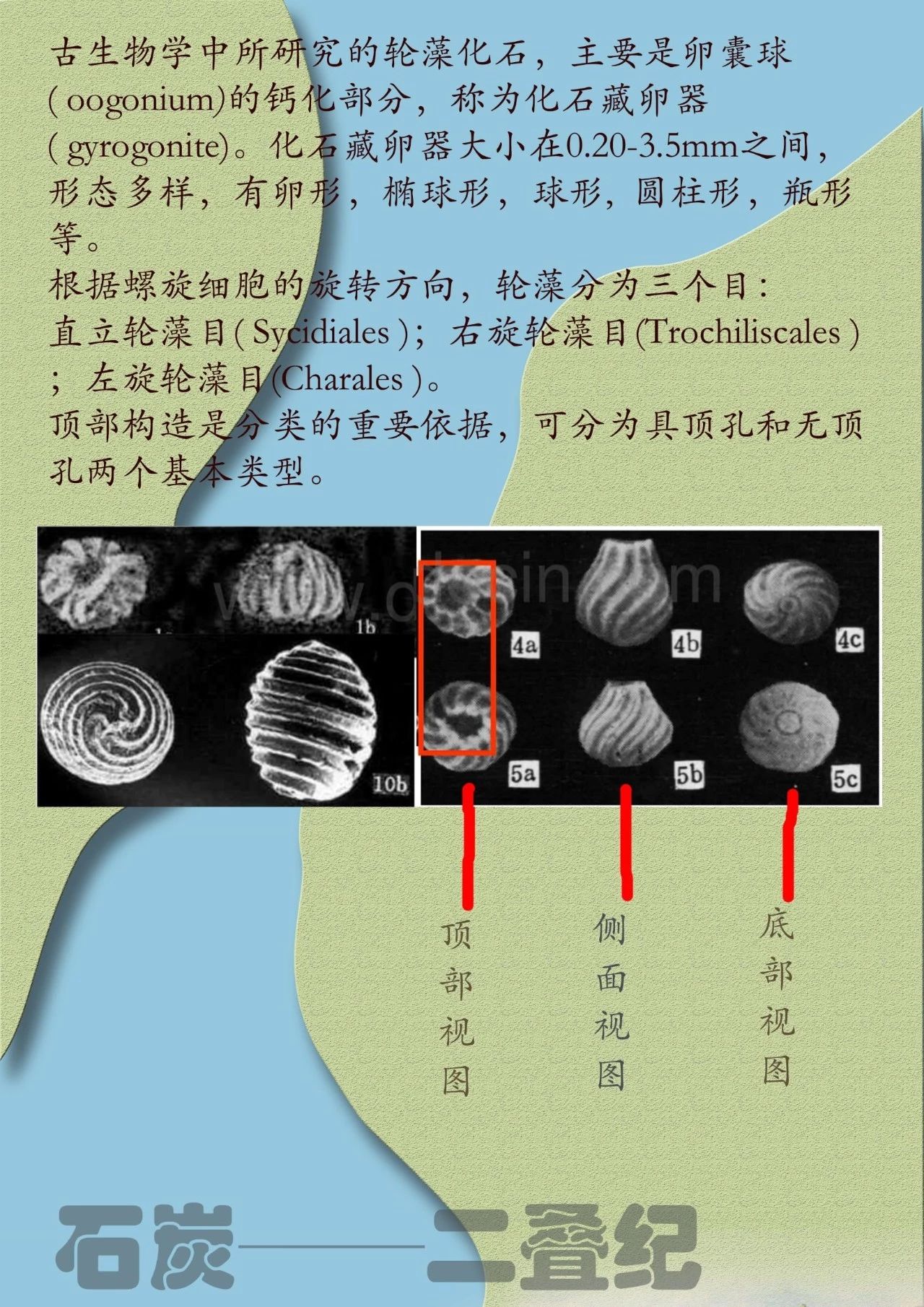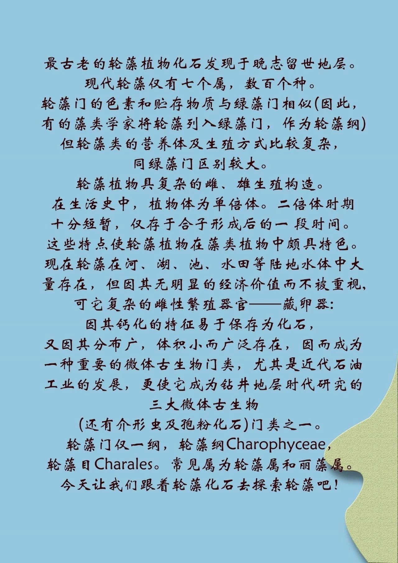 以上只是輪藻的雌性生殖器官藏卵器的化石。這個(gè)特點(diǎn)使輪藻植物在藻類植物中頗具特色。輪藻門的有性生殖器官發(fā)達(dá),它們均生在小枝上,雌雄同株或異株,藏卵器呈長(zhǎng)圓形,外面由5列細(xì)胞包被,最下部的5個(gè)細(xì)胞長(zhǎng)形,螺旋形圍繞,位于藏卵器頂端的細(xì)胞很短。藏精器呈球形,外壁由8個(gè)(罕見(jiàn)4個(gè))盾片狀的細(xì)胞組成。輪藻門除有性生殖外,有的種類地下假根部分的節(jié)上可產(chǎn)生珠芽,以進(jìn)行營(yíng)養(yǎng)繁殖。