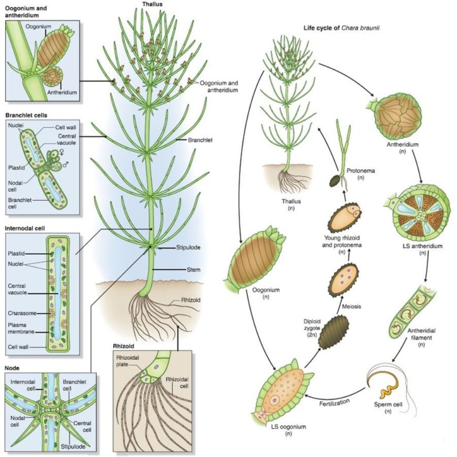輪藻屬是輪藻門輪藻科最常見(jiàn)的一屬,莖或小枝多具皮層;小枝不分叉,但節(jié)上生有苞片細(xì)胞。雌雄同株、雌雄配子囊混生者,藏精器生于藏卵器的下方。