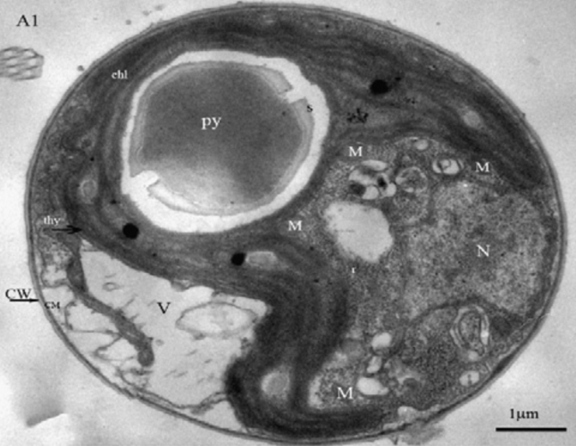 圖2.小球藻透射電鏡照片(Liu &Xiong,2009),“py”表示蛋白核。
