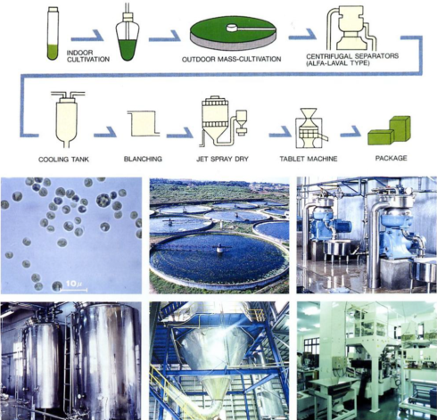 圖5.八重山的小球藻養(yǎng)殖工藝,首先進(jìn)行種子液的培養(yǎng),然后在圓池中進(jìn)行放大培養(yǎng),以碟片式離心機(jī)進(jìn)行濃縮,濃縮液冷卻后(抑菌)進(jìn)行短暫的加熱處理(滅菌及滅葉綠素酶酶活),進(jìn)行噴霧干燥后即可進(jìn)行壓片等后續(xù)加工。(破壁的工藝有幾種可選,如對(duì)濃漿進(jìn)行碾磨或高壓均質(zhì),對(duì)干粉進(jìn)行氣流對(duì)撞等)