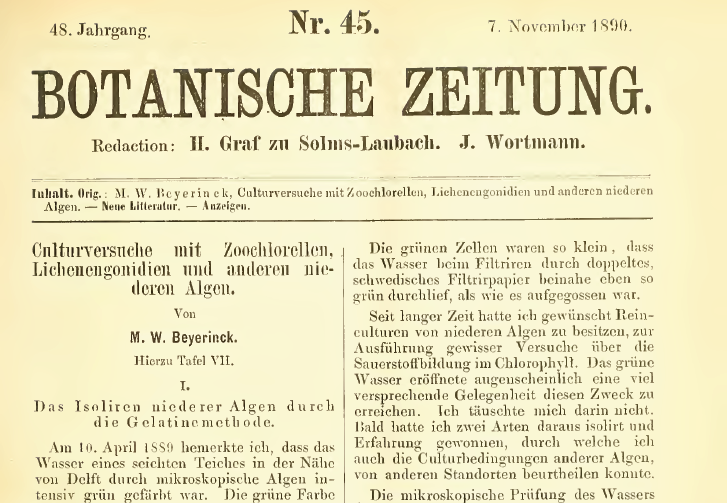 圖3.一百多年前的文獻(xiàn),Beijerinck發(fā)現(xiàn)小球藻的論著。