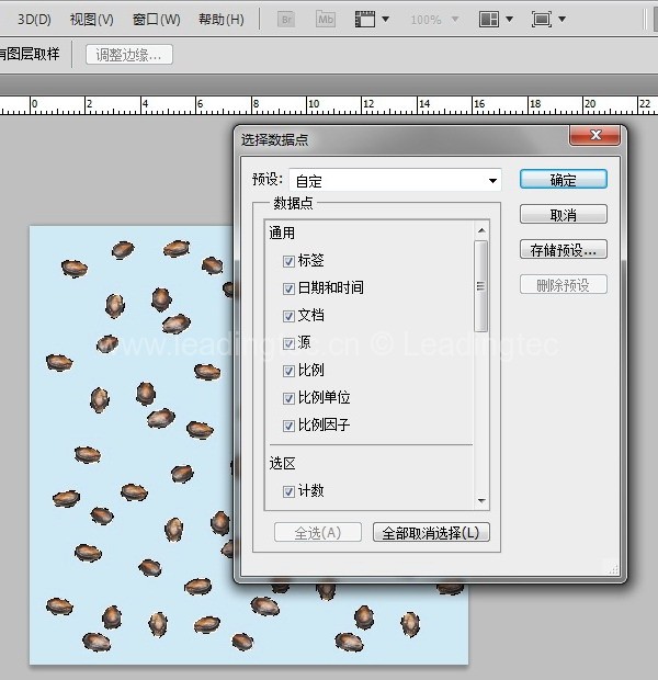 4、選擇“圖像>分析 > 選擇數(shù)據(jù)點(diǎn) > 自定”。在選區(qū)中,選擇“計(jì)數(shù)”并單擊“確定”;