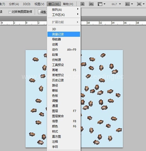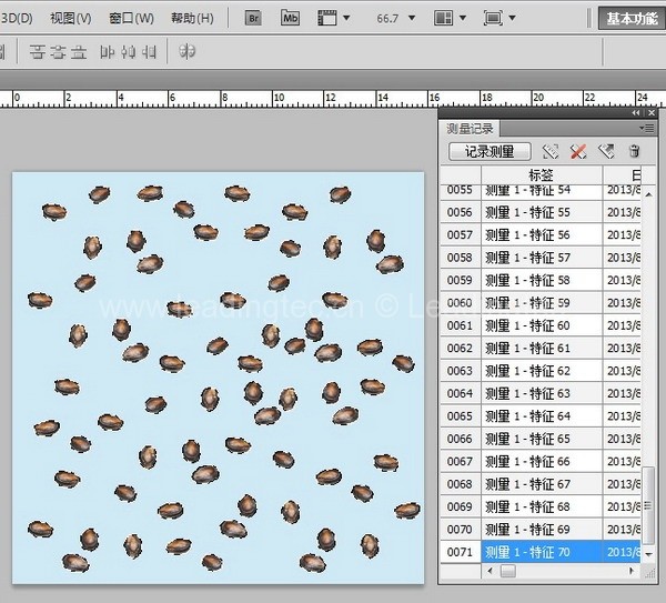 3、選擇魔棒工具 > 點(diǎn)擊空白處 > 反向,得到所有瓜子的選區(qū)。若圖片中含有少量雜質(zhì)或接觸在一起的瓜子,可通過(guò)“選擇 > 修改 > 收縮”進(jìn)行去除或分離;