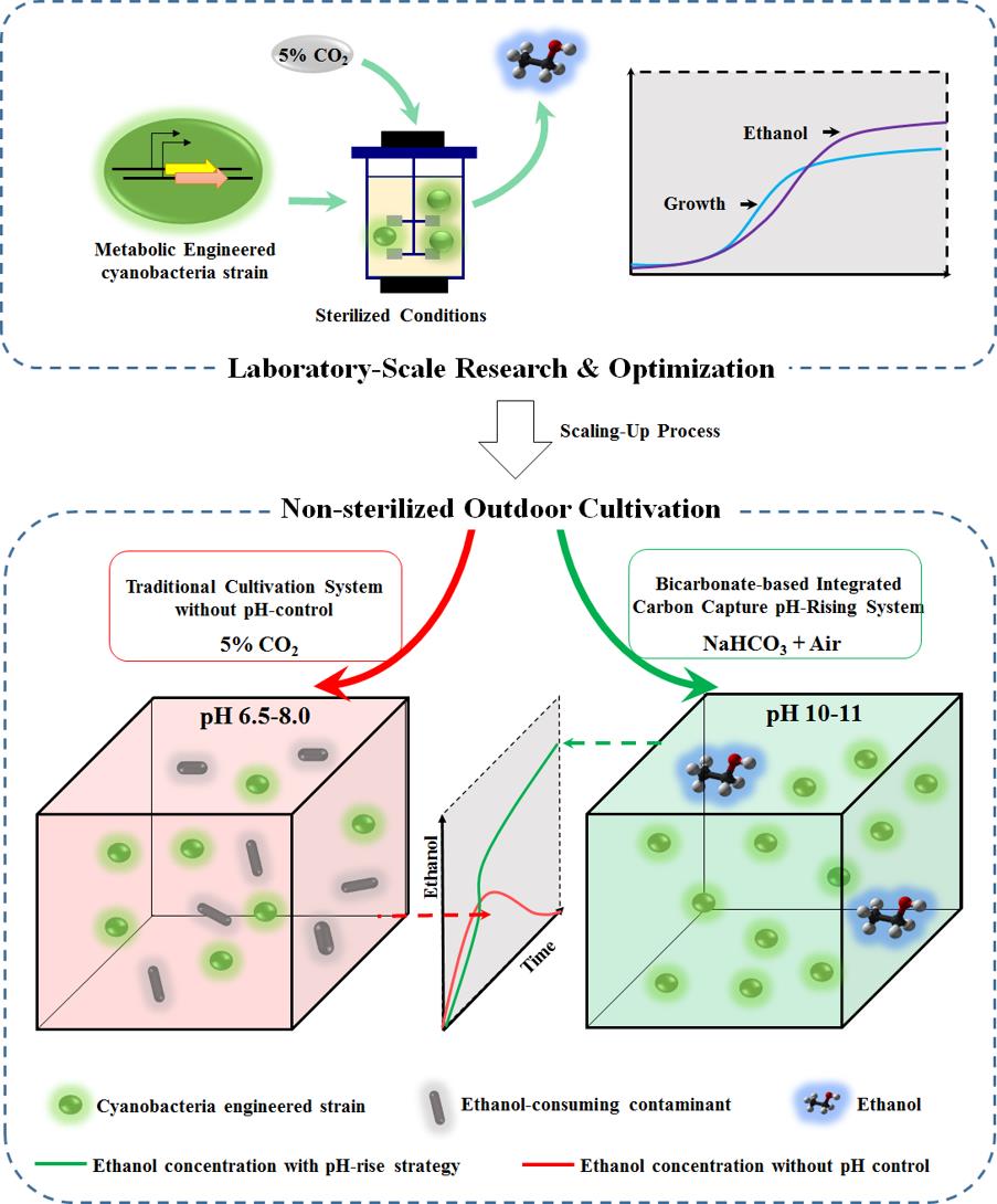 基于已經(jīng)開發(fā)的藍(lán)細(xì)菌乙醇光合工程藻株,該團(tuán)隊又進(jìn)一步探索了光合細(xì)胞工廠的擴(kuò)大化培養(yǎng)技術(shù)。光合生物制造通常在戶外、開放式、未滅菌的條件下進(jìn)行,因此經(jīng)常面臨各種模式的生物污染的嚴(yán)重威脅進(jìn)而導(dǎo)致擴(kuò)大培養(yǎng)的失敗。研究人員在進(jìn)行工程藻株Syn-HZ24的開放式、規(guī)?;囵B(yǎng)中發(fā)現(xiàn),其乙醇合成與積累過程受到了微生物污染的嚴(yán)重影響。通過分析和鑒定,確定了Pannonibacter phragmitetus為乙醇光合合成的主要威脅來源,該菌可以以乙醇為唯一碳源進(jìn)行生長,迅速消耗工程藻株合成的乙醇并在培養(yǎng)體系中大量增殖。通過對Pannonibacter phragmitetus和Syn-HZ24的生理和生化分析,研究人員提出提高培養(yǎng)體系pH值來抑制Pannonibacter phragmitetus侵染并恢復(fù)乙醇光合合成的設(shè)想(Bicarbonate-based Integrated Carbon Capture System, BICCS),并在實驗室柱式反應(yīng)器和戶外薄膜掛袋兩種體系下進(jìn)行了驗證,結(jié)果表明該策略可以有效解決Syn-HZ24在開放式培養(yǎng)過程中的生物污染問題,在規(guī)?;囵B(yǎng)9天后乙醇產(chǎn)量達(dá)到0.9g/L,而常規(guī)pH條件下的對照體系中無乙醇積累。此部分工作鑒定了一種工程藍(lán)細(xì)菌規(guī)?;囵B(yǎng)過程中新的生物污染模式,并針對性地設(shè)計、驗證了解決方案,對光合細(xì)胞工廠培養(yǎng)的工程化、規(guī)?;l(fā)展有普遍的借鑒意義。該工作近期發(fā)表于Biotechnology for Biofuels(Zhu, et al, 2017, 10:93)。