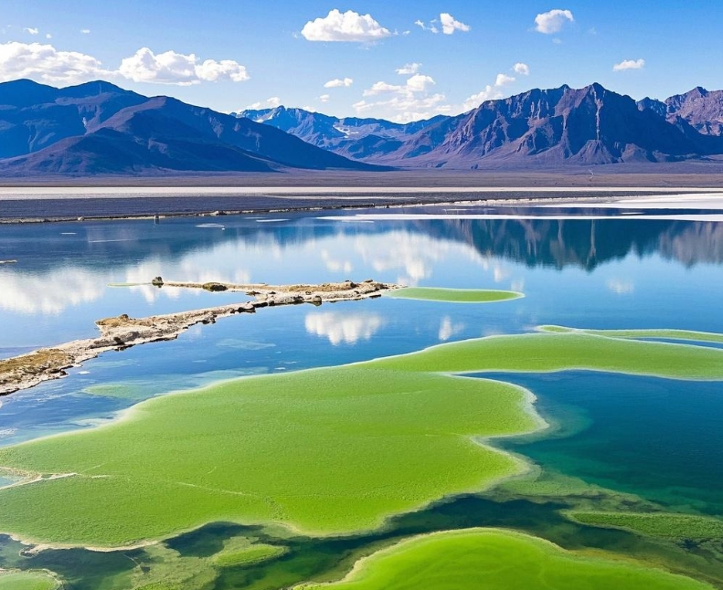 杜氏鹽藻隸屬綠藻門,是大自然的 “極限運(yùn)動(dòng)健將”。它安家于鹽湖、鹽田等高鹽度水域,這些地方鹽度常接近飽和,普通生物望而卻步,強(qiáng)烈的日曬、劇烈的水溫波動(dòng)以及高鹽堿度共同構(gòu)筑起殘酷生存挑戰(zhàn),而杜氏鹽藻卻怡然自得。拿我國的運(yùn)城鹽池來說,這里鹽度頗高,周邊環(huán)境看似荒蕪,可杜氏鹽藻卻大量繁衍。其細(xì)胞有著精妙的滲透壓調(diào)節(jié)機(jī)制,恰似一臺(tái)臺(tái)精密微型泵,高效平衡細(xì)胞內(nèi)外鹽分濃度,確保在鹽分超高的 “鹵水世界” 維持正常生理活動(dòng),頑強(qiáng)繁衍不息。在鹽田鹵水蕩漾中,密集的杜氏鹽藻匯聚,常將水面暈染成大片夢(mèng)幻般的淡綠色 “藻華”,與周邊荒蕪鹽灘構(gòu)成鮮明反差,成為死寂之地一抹靈動(dòng)亮色。清晨時(shí)分,運(yùn)城鹽池的湖水常呈淡綠色,隨著陽光逐漸增強(qiáng),鹽藻光合作用加劇,細(xì)胞內(nèi)的色素濃度改變,湖水顏色逐漸變深;到了午后,若鹵蟲(杜氏鹽藻的 “鄰居”,二者存在共生關(guān)系)聚集,水面又會(huì)泛起一片粉紅,宛如 “火焰漣漪”,景致十分迷人。