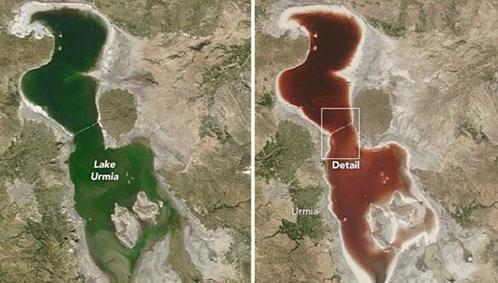 據(jù)報(bào)道,美國(guó)國(guó)家航空航天局(NASA)的Aqua衛(wèi)星在7月拍攝到了伊朗咸水湖烏爾米湖整個(gè)被“染成”壯觀的血色。NASA官方稱因?yàn)榧竟?jié)性降水和氣候模式,該湖泊的顏色轉(zhuǎn)變?cè)诖禾旌统跸暮芷毡椤Pl(wèi)星在4月23日拍攝的圖片顯示湖水為綠色,但是在7月18日拍攝的圖片中湖水卻變成了酒紅色或更夸張地說(shuō)是血色。