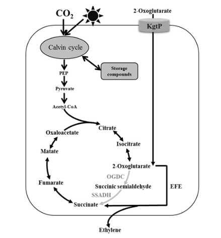 因藍細菌三羧酸循環(huán)相對獨特,缺乏α-酮戊二酸脫氫酶,α-酮戊二酸到琥珀酸的轉(zhuǎn)化,可由α-酮戊二酸脫羧酶(ogdc)和琥珀酸半醛脫氫酶(ssadh)催化完成。為增加efe的直接底物α-酮戊二酸的供應(yīng)同時進一步提高乙烯產(chǎn)量,研究人員敲除了乙烯合成菌株odgc和ssadh的編碼基因,同時在這兩個位點各引入一份 efe拷貝。研究者還在所構(gòu)建的三拷貝efe菌株中表達了來源于大腸桿菌的α-酮戊二酸通透酶,在外源添加α-酮戊二酸的條件下分析了乙烯合成菌株的碳源分配,從而進一步提高了乙烯產(chǎn)量。經(jīng)過培養(yǎng)條件優(yōu)化,基因工程藍細菌的乙烯產(chǎn)能最終可達9.7mll -1h-1,為目前報道的最高水平。