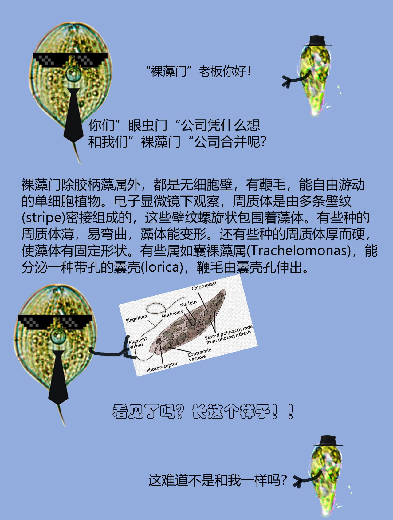 原來(lái)裸藻是古代原生動(dòng)物眼蟲的植物學(xué)名稱,因?yàn)檠巯x同時(shí)具有動(dòng)物與植物兩種特性,它是一種”原生動(dòng)物”,但是同時(shí),眼蟲的細(xì)胞卻又有含葉綠素的葉綠體,能夠進(jìn)行光合作用,自己制造營(yíng)養(yǎng)。因此,植物學(xué)家認(rèn)為,它是一種”原生植物”;由于它的細(xì)胞外面沒(méi)有細(xì)胞壁,植物學(xué)家給它起了另外一個(gè)名字–裸藻