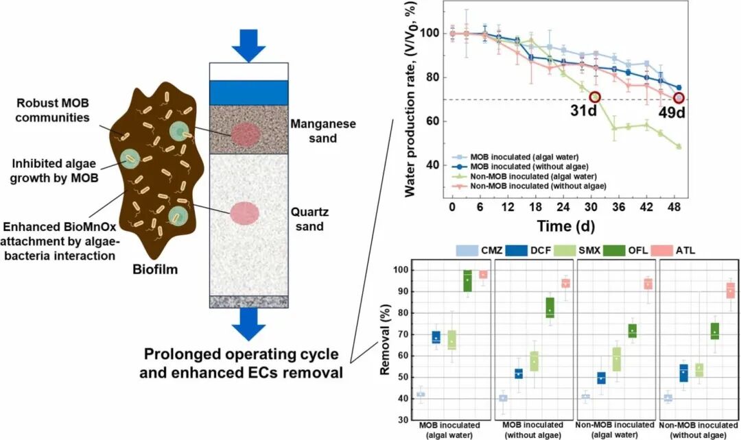 綜上,本研究證實藻菌相互作用可通過誘導(dǎo)BioMnOx生成強化新興污染物去除,同時通過調(diào)控藻類生長維持濾池高效穩(wěn)定運行。該發(fā)現(xiàn)為提升慢速砂濾池的污染控制能力、延長運行周期提供了新的技術(shù)思路,凸顯了藻菌共生體系在飲用水深度處理領(lǐng)域的應(yīng)用潛力。