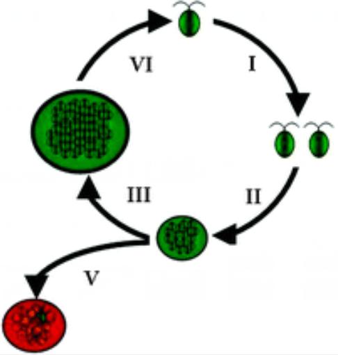 圖4. 雨生紅球藻不動孢子進(jìn)入繁殖周期的示意圖 (from algaecan.com)