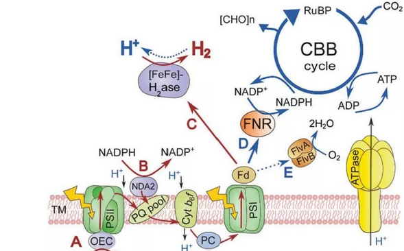 當(dāng)我們需要綠藻產(chǎn)氫時(shí),綠藻的葉綠體吸收太陽(yáng)光從而獲得能量,將水光解為氫離子、電子和氧氣,通過(guò)藻細(xì)胞組織將電子不間斷地傳遞給輔酶NADP,這樣輔酶NADP就成為了氫離子的載體,NADPH里面的氫離子和電子依次經(jīng)過(guò)質(zhì)體醌、細(xì)胞色素、質(zhì)體藍(lán)素的傳遞,最終被傳遞到光合作用系統(tǒng)Ⅰ(PSⅠ)的鐵氧還原蛋白上。鐵氧還原蛋白在厭氧條件下誘導(dǎo)出[FeFe]氫化酶活性,從而使氫離子在[FeFe]氫化酶上吸收電子產(chǎn)生氫氣。如下圖紅線路徑所示。