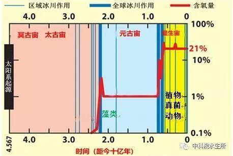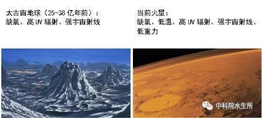水是生命之源?;鹦且簯B(tài)水湖的存在暗示它可能擁有外星生命。但外星生命長(zhǎng)什么樣?這主要取決于外星球的環(huán)境。就火星而言,其輻射強(qiáng)烈、缺氧低壓、溫度巨變、荒涼多沙,這些環(huán)境特點(diǎn)與早期地球陸地最為接近(圖2),而早期地球(25億年前)只存在一些極端環(huán)境微生物。其中一類極端微生物——藻類,在海洋中大量繁殖,利用光合作用吸收CO2,放出O2, 經(jīng)過(guò)漫長(zhǎng)過(guò)程,終于將地球大氣的氧氣含量從接近于零逐漸提高到1%以上,為高等的地球生命(如真菌、植物和動(dòng)物等)的進(jìn)化提供了必需的物質(zhì)條件(圖3)。
