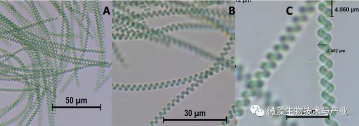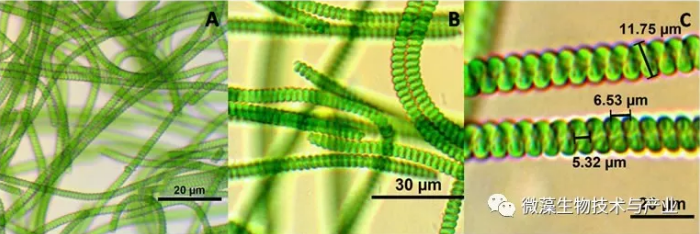 形態(tài)大小:螺旋或直線狀,藻體寬度2.5-16μm,螺旋直徑15-60μm,螺旋長(zhǎng)度:0-80μm(注意:不同藻種之間,或同一藻種不同培養(yǎng)條件,這些參數(shù)變化較大)