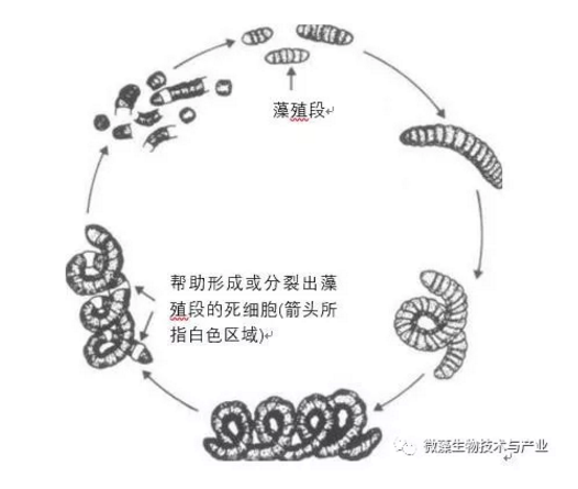 螺旋藻通過裂殖方式進(jìn)行繁殖,螺旋藻生長(zhǎng)到一定階段,藻絲體中出現(xiàn)Necridia (幫助形成或分裂出藻碎片的死細(xì)胞),然后藻體多數(shù)在此處斷裂,形成藻體碎片(藻殖段),藻殖段逐漸分裂出新的細(xì)胞,延伸,形成螺旋,然后到一定時(shí)期,再斷裂出藻殖段,如此循環(huán),繁殖。