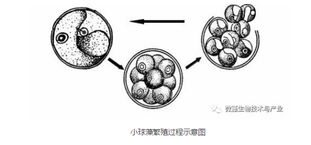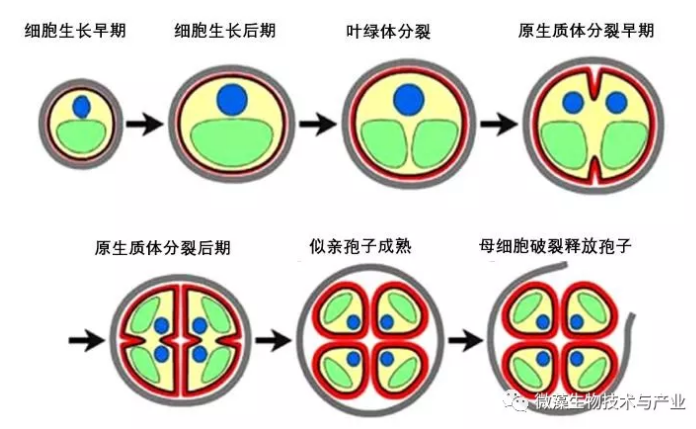 小球藻通過無性生殖進(jìn)行繁衍。簡(jiǎn)單來說,母細(xì)胞內(nèi)出現(xiàn)多個(gè)似親孢子(autospore),然后母細(xì)胞破裂,釋放多個(gè)似親孢子。然后,這些似親孢子生長(zhǎng),待成熟后再通過上述一樣的方式進(jìn)行繁衍,如此循環(huán)。母細(xì)胞內(nèi)的孢子數(shù)一般在2~16個(gè)之間。