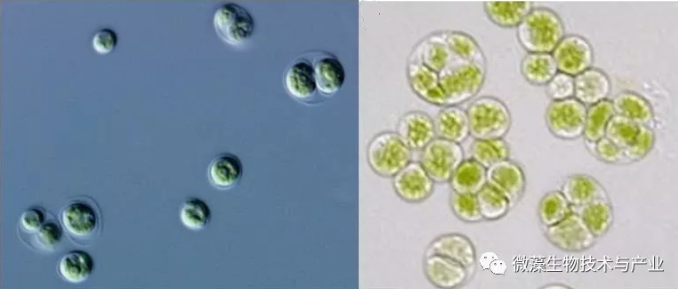 小球藻繁殖過程的細(xì)胞  (左圖:母細(xì)胞內(nèi)有兩個(gè)孢子;右圖:母細(xì)胞中內(nèi)有多個(gè)孢子)