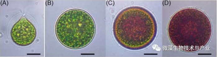 雨生紅球藻的生命周期比較復(fù)雜,在不同的環(huán)境條件下具有不同的細(xì)胞形態(tài),在生長(zhǎng)環(huán)境比較適合的時(shí)候(營(yíng)養(yǎng)充足、溫度和光照合適等),藻細(xì)胞以綠色游動(dòng)細(xì)胞存在(有兩條鞭毛,圖A),當(dāng)環(huán)境條件變差時(shí),藻細(xì)胞失去鞭毛,變成綠色不動(dòng)細(xì)胞(圖B),當(dāng)環(huán)境條件繼續(xù)變差,藻細(xì)胞內(nèi)積累蝦青素朝不動(dòng)孢子轉(zhuǎn)變(圖C),最后變成含有大量蝦青素的不動(dòng)孢子(圖D)。然而,當(dāng)外界環(huán)境條件變好時(shí),即外界環(huán)境適合藻細(xì)胞生長(zhǎng)時(shí),不動(dòng)孢子(圖D)又會(huì)轉(zhuǎn)變成綠色游動(dòng)細(xì)胞(圖A).