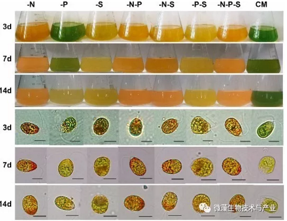 不同營(yíng)養(yǎng)饑餓條件下的培養(yǎng)過程及細(xì)胞變化(Source: Hexin Lv et al,Analysis of the Physiological and Molecular Responses of?Dunaliella salina?to Macronutrient Deprivation,Plos one, 2016)