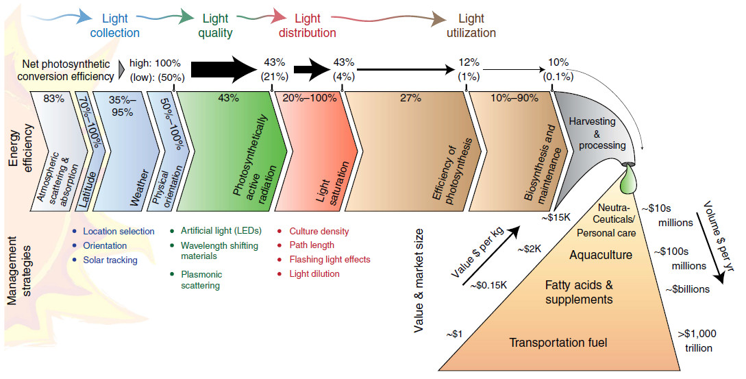 太陽能/藻細(xì)胞生物質(zhì)的能量轉(zhuǎn)化率及其管理策略示意
