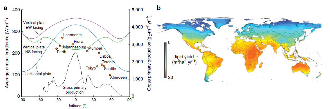 全球的太陽能分布不均勻,在赤道附近平均太陽能最高(低緯度地區(qū)),兩極最低。此外,各地區(qū)的氣候及氣象情況(陰雨天多,臺風(fēng)等)也顯著地的影響地面上獲得的太陽能。此外,還要結(jié)合當(dāng)?shù)氐乃Y源,原材料、人力、基礎(chǔ)設(shè)施條件來確定微藻培養(yǎng)地點(diǎn)。