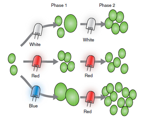 用于光合作用的光波長為400-700nm。不同光譜的光對微藻生長及產(chǎn)物積累的影響具有重要影響。藍(lán)光可以提高小球藻葉綠素合成和微擬球藻的油脂合成。紅光能提高雨生紅球藻細(xì)胞生長,藍(lán)光可以提高藻細(xì)胞中蝦青素的合成。藍(lán)光條件培養(yǎng)小球藻2天顯著促進(jìn)藻細(xì)胞增大,然后在紅光條件下促進(jìn)小球藻細(xì)胞分裂,藻細(xì)胞產(chǎn)量提高了20%以上。