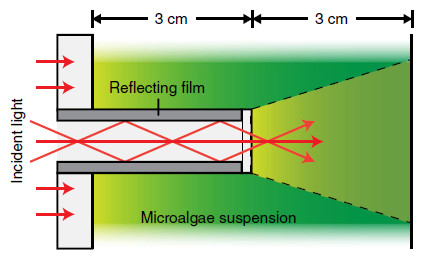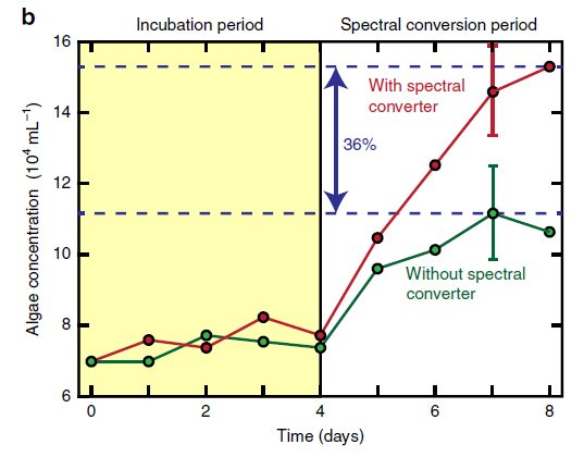 通過熒光和磷光材料將一種波長的光轉(zhuǎn)化成另外一種波長的光。實驗表明在北面使用轉(zhuǎn)光材料的光反應(yīng)器中,雨生紅球藻在低密度培養(yǎng)時,藻細(xì)胞濃度提高了36%。