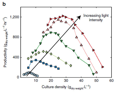 微藻培養(yǎng)的產(chǎn)率與藻細(xì)胞密度、光程、混合等相關(guān),需要從這幾個方面進(jìn)行綜合優(yōu)化。混合與藻細(xì)胞的光暗循環(huán)頻率相關(guān),其影響藻細(xì)胞的生長。