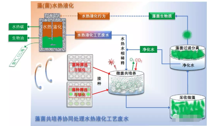 其中,結(jié)合微藻與可絮凝分離的微藻、真菌或細菌協(xié)同處理水熱液化工藝廢水有望實現(xiàn)水熱液化工藝廢水高效處理,同時實現(xiàn)微藻高效采收。這不僅提供了微藻培養(yǎng)營養(yǎng)來源,并高效處理了水熱液化工藝廢水、生產(chǎn)了微藻生物質(zhì)原材料,處理后的凈化水可用于水熱水相的稀釋,從而得到適宜微生物生長的水熱液化工藝廢水中營養(yǎng)物質(zhì)(污染物)含量范圍。該系統(tǒng)通過接種藻、菌種,輸入光照、CO2等即可獲得氧氣、生物油、水熱炭等產(chǎn)物。