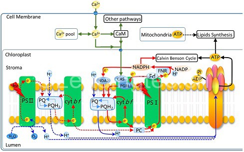 近期,該學(xué)科組還使用模式綠藻chlamydomonasreinhardtii進(jìn)一步驗(yàn)證了上述過(guò)程,提出缺氮脅迫顯著抑制光合作用線性磷酸化和呼吸磷酸化及相應(yīng)atp生物合成的情況下,ca2+介導(dǎo)的光合作用環(huán)式磷酸化為缺氮誘導(dǎo)的微藻油脂生物合成過(guò)程提供能量,初步形成了綠藻中性脂生物合成的調(diào)控模型(scientificreports2015)。