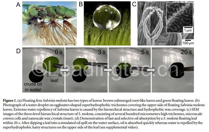 早前,科學(xué)家們已經(jīng)知道槐葉蘋屬水生蕨類具有疏水性,即對(duì)水具有排斥能力。而這則是因?yàn)樗娜~子被一層毛狀體覆蓋,這意味著葉子表層具備了一定的張力進(jìn)而使水無法通過。