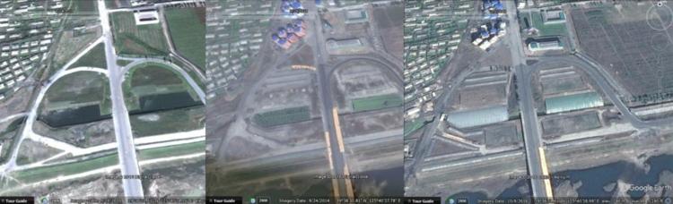 左、中、右分別為 2010 年、2014 年和 2016 年朝鮮南雄池塘的照片