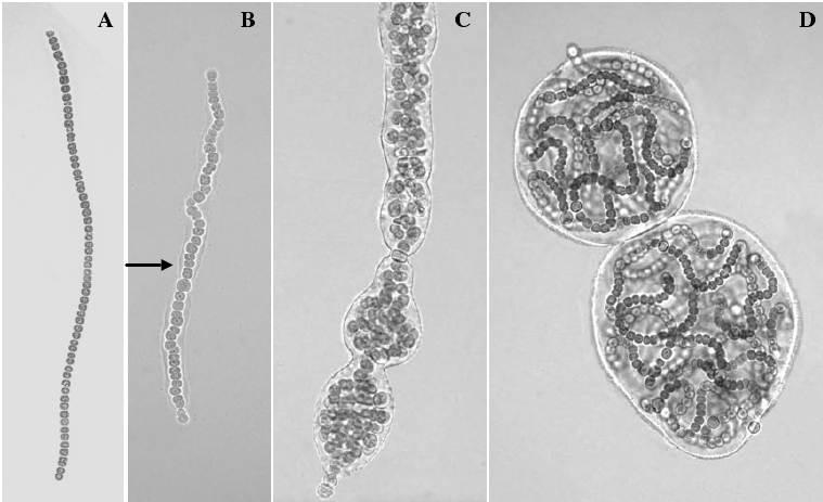 圖11.葛仙米藻絲群體發(fā)育過程;A.藻絲,B.具有鞘的絲狀體,C.非絲狀體群體和D.絲狀體群體。(引自鄧中洋博士論文,2006)