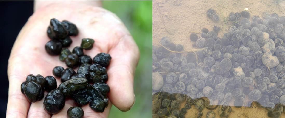 圖7. 不同大小不同顏色的(近)球狀的念珠藻(左下角最大的那個重2.6公斤,直徑22cm,估計生長了大約9-14年,老俞看到此圖一下子覺得自己沒見過世面,應(yīng)該再回去讀一遍博士。圖片收集感謝神梯,度娘還是差了點?。?/span>