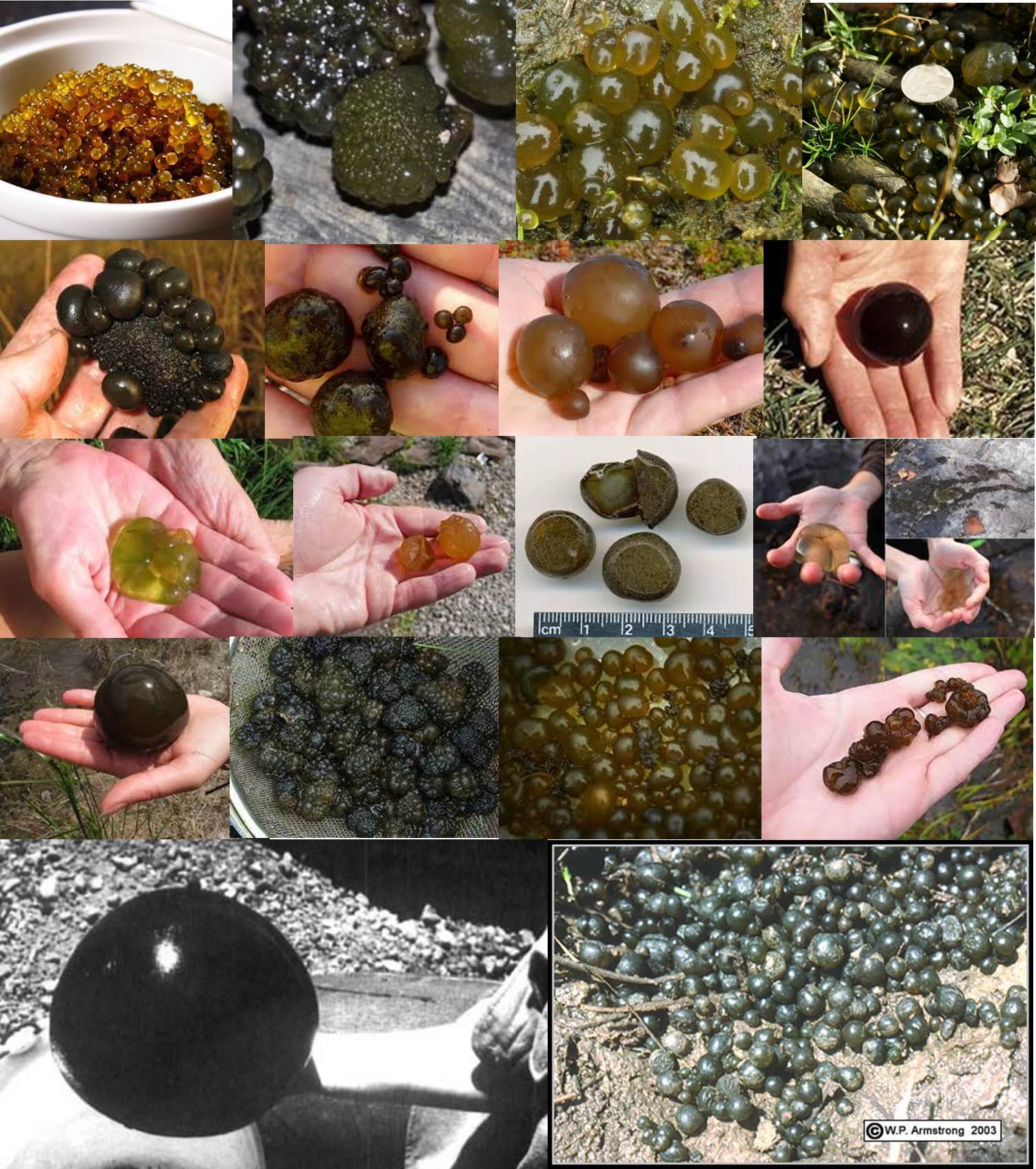 圖7. 不同大小不同顏色的(近)球狀的念珠藻(左下角最大的那個重2.6公斤,直徑22cm,估計生長了大約9-14年,老俞看到此圖一下子覺得自己沒見過世面,應(yīng)該再回去讀一遍博士。圖片收集感謝神梯,度娘還是差了點?。? width=