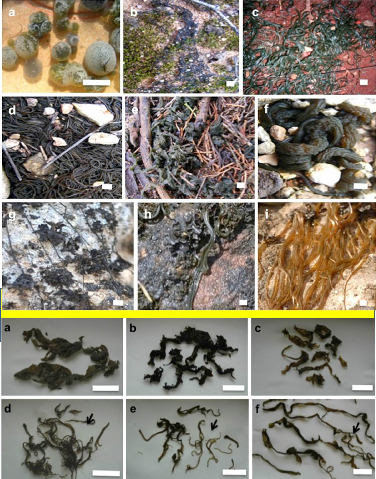 圖9.各色形狀的絲狀念珠藻(上半部a為球狀的普通念珠藻,其他為世界各地的發(fā)狀念珠藻;下半部(黃線以下)為部分發(fā)狀念珠藻的干品狀態(tài)。M. Aboal et. Al., 2016)