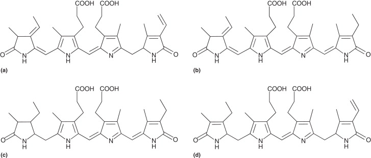 圖1.?幾種藻膽素的化學(xué)結(jié)構(gòu).(a)藻紅膽素(phycoerythrobilin),(b)藻藍(lán)膽素(phycocyanobilin),(c)藻紫膽素(phycoviolobilin)和(d)藻尿膽素(phycourobilin)。