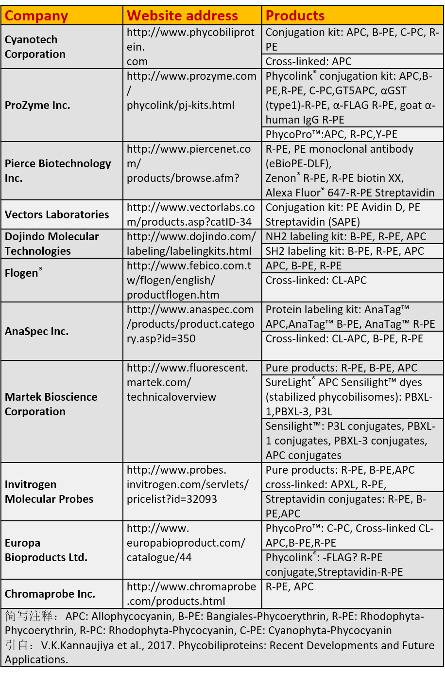 國外一些生產(chǎn)藻膽蛋白生物制劑的企業(yè)及產(chǎn)品