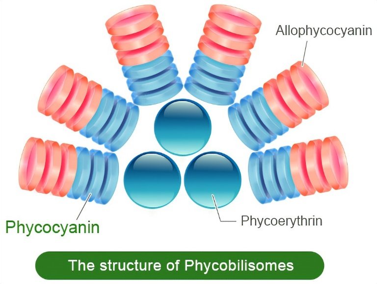 所有的藻膽蛋白(包括藻藍(lán)蛋白和別藻藍(lán)蛋白)的結(jié)構(gòu)是類似的。以藻藍(lán)蛋白為例,藻藍(lán)蛋白為兩個亞基組成異二聚體蛋白,兩個亞基稱為αβ,其中α亞基聯(lián)結(jié)了一個藻藍(lán)膽素,β亞基聯(lián)結(jié)了兩個藻藍(lán)膽素,這樣三個二聚體蛋白首尾相連,就成為一個三聚體的甜甜圈式結(jié)構(gòu),也存在兩個三聚體緊密交疊形成六聚體,也是甜甜圈結(jié)構(gòu),直徑都為11nm左右。
