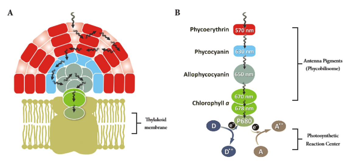 圖4.?A. 位于類囊體膜上的藻膽體的示意,B。能量轉(zhuǎn)移(包括電荷分離)的步驟。每個藻膽體包含一個由別藻藍(lán)蛋白組成的核心,從這個核心,由藻藍(lán)蛋白和藻紅蛋白組成的幾根桿狀體向外延伸,起著收集光線的天線的作用,通過這些“桿子”吸收的能量被有效地轉(zhuǎn)移到葉綠素色素中,供它們在光合反應(yīng)中使用。(ATT Bioquest?)