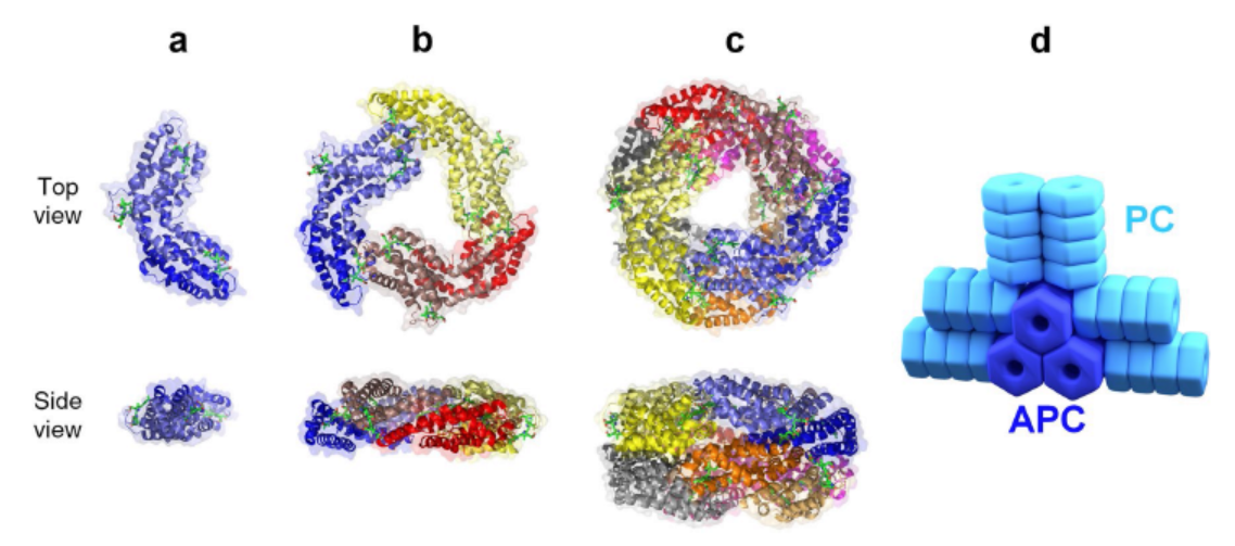 在藻膽體上的位置,藻藍(lán)蛋白是伸出來的天線(6-8摞),別藻藍(lán)蛋白是基底的核心(2-5摞)。如下圖d所示,兩者疊放的方向也是不同的。