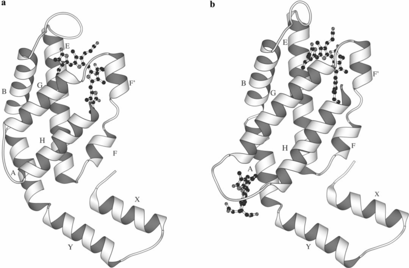 圖3. 藻膽素(上圖黑點結(jié)構(gòu))與一些可溶性蛋白結(jié)合形成藻膽蛋白(亞基),圖中a、b分別為藻藍(lán)蛋白的α和β亞基。