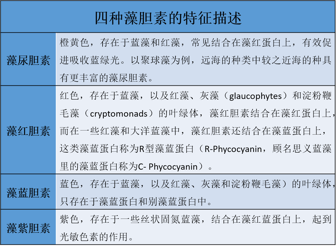 因為不同地區(qū)的翻譯和商業(yè)名稱的問題,首先列個中英對照的表格,對本文中提到的相關(guān)稱呼進(jìn)行限定。清一色的“phyco”前綴,看的人眼花繚亂、頭暈?zāi)垦?。(注:phyco-,意思為藻的/與藻相關(guān)的)